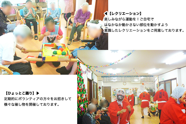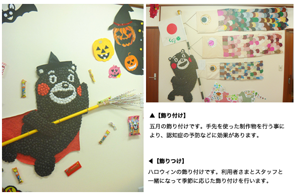 | サービス内容 | 季節毎のイベントの他、裁縫や紙細工など様々なレクリエーションを行っております。 |