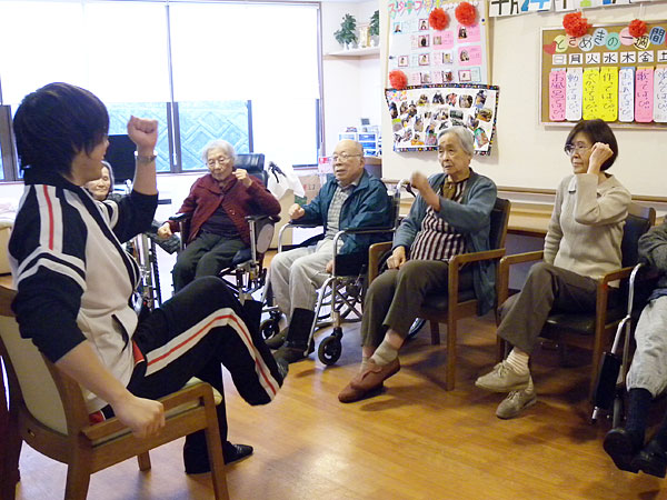 体操教室では体を動かし機能向上を目指します。他にも、制作活動や手作りおやつバイキング、ボランティアコンサート、一緒にご飯を作ったりとコミュニケーションを通し楽しみながら機能訓練を行います。