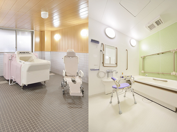 チェアインタイプの機械浴槽を導入し、普段と同じように座った状態でご入浴いただけます。個浴槽は移動の負担がないよう各フロアにご用意しております。