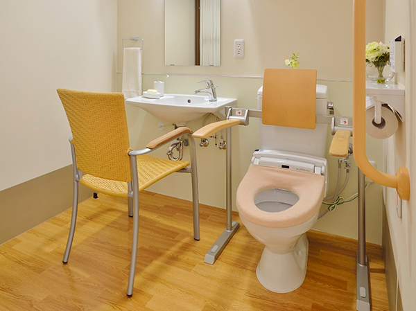居室内には使いやすい広さの車椅子対応のトイレと洗面所を備え付けております。