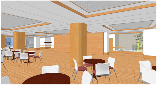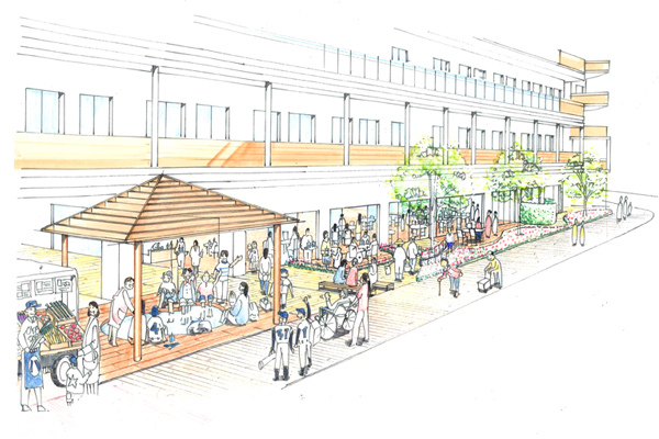 特徴は「共生型」であること。地域の人々が気軽に訪れやすく、特別な目的がなくても集い交流できる場所として、“ふれあいはつらつ広場”や“ふれあい農園広場”・オープンカフェなどを設置します。カルチャースクールやイベントなども開催し、『地域に開かれたリビング』のような場を目指します。