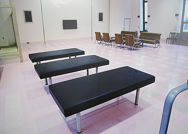 本館1階には広々としたデイサービスセンターを併設。このデイサービスには、マッサージや電気療法、運動療法を行い、日常生活の基本的な動作や作業などを通して機能回復をサポートする作業療法士など、専門の国家資格をもつスタッフ、消炎沈痛を行う鍼灸マッサージ師が常勤。