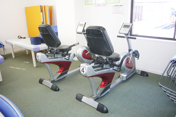 写真のリカンベントバイクでは、心肺機能を高め、疲れにくい身体づくりに役立ちます。また、スムーズな歩行動作に必要な太もも、ふくらはぎを鍛えてくれます。