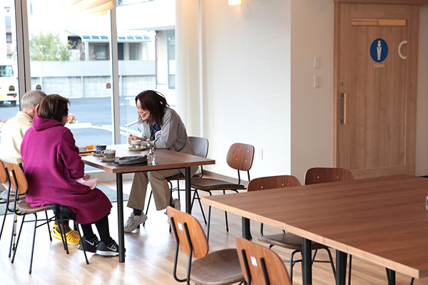 天満ウェルネス名東では、ご家族様にとっても“安心していただける施設”を目指しています。1階にはCAFEを併設しており、入居者様との時間をゆっくりと過ごしていただくことができます。CAFEを利用していただくことで、入居者様はもちろん、職員とご家族様、また、ご家族様同士も交流を深め、一つの大家族として“幸せ”を共有していける空間作りをしています。そして、私たち職員も家族のような身近な存在でありたいと考えています。