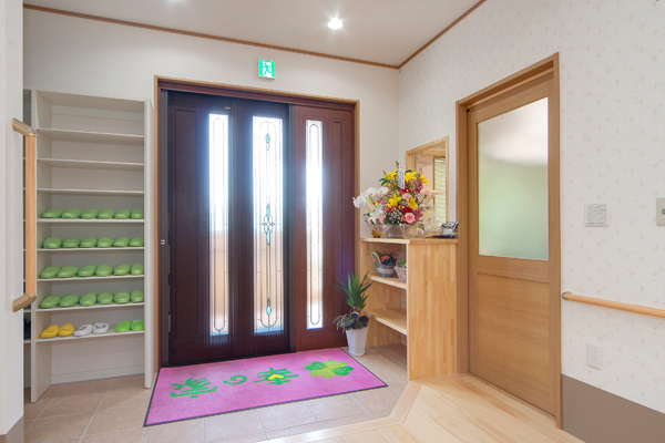 落ち着いた色合いで入居者を迎えるバリアフリーの玄関です。