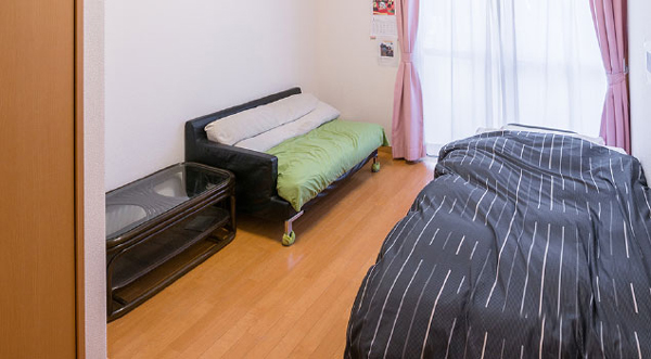 陽当りの良い明るい居室です。エアコン・ベッド・クローゼット完備の個室ですので、長期宿泊でも快適にお過ごしいただけます。