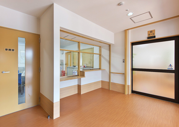 職員が常駐する事務所はホールの真ん中に配置され、ご入居中の皆様に目が向けられる様配慮しております。また、ナースコールが鳴った場合も即座に対応することができます。