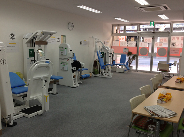 パワーリハビリ「生活動作再現トレーニング」6台のマシントレーニング毎回1時間30分程。ゆっくりした動作での有酸素運動(不活動筋を再活性化し改善)低負担・10回反復運動・ご本人様が楽に感じる重さ(負荷)で行っています。
