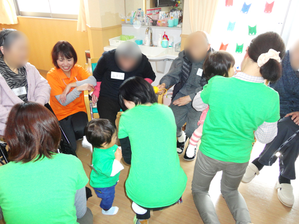 直接ご利用者様と地域へ出向き、行事へ参加するのはもちろん、世代間交流にも焦点を当て積極的に行なっております。上の事例は乳幼児とママさんとの交流のご様子です。