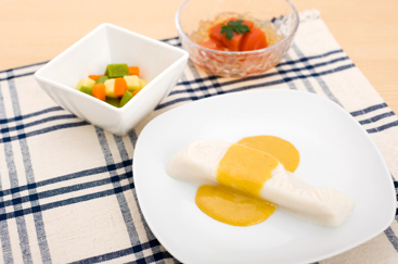 調理済みの普通食をミキサーにかけ、介護調整食材で固め、元の形に再成形したものが、「すむーす食つるりん」です。なめらかな食感で、食塊を作り、飲み込みやすくしました。魚なら魚、お肉ならお肉と、素材本来の彩りや形を見た目で楽しめる、そんなお食事です。「すむーずにつるりんと飲み込んでいただけるように」と長寿の思いを「つる」に込め、「すむーす食つるりん」と名づけました。