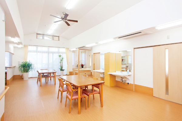 明るく解放感のある食堂です。関連事業所の提供する配食センターより、皆様にあたたかく栄養管理の行き届いたお食事を提供します。また、ご家族の方やご入居者様とのコミュニケーションの場としてご自由にお使い頂けます。