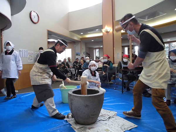 年の瀬には恒例の持ちつき大会を開催します。つきたてのお餅で餡ころ餅や黄粉餅をつくります。