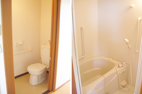 ワンルームタイプマンションなので、各居室にトイレと浴室を設置しております。浴室での介護が必要な方は、訪問介護をご利用したり、別の介護用浴室もご用意しております。