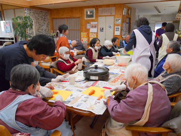 日常生活のリハビリも兼ねて、みんなで料理を行っている風景です。また、ゆりの里農園で育った無農薬で安心の美味しい食事を作ります。