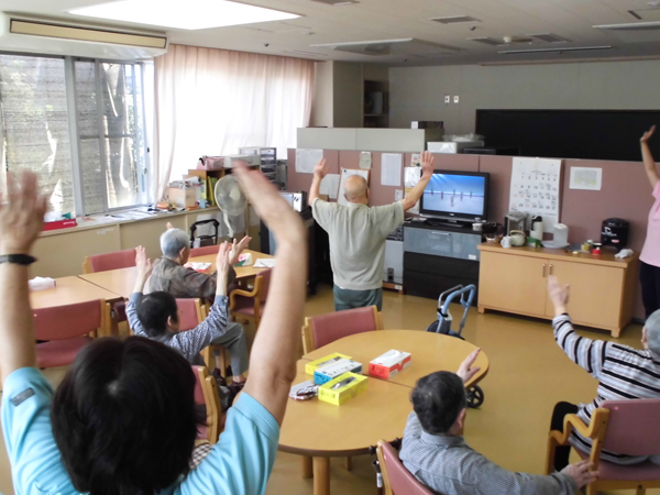 介護サービスが必要になった時には,ケアマネージャーのケアプランに基づきサービス利用が可能です。(写真は通所介護事業所の体操風景)
