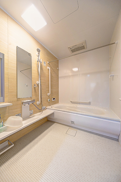 明るく広々とした浴室はリラックスしてご利用いただけます。