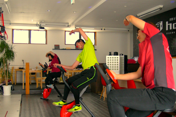 個別音楽に合わせて自転車をこぎながら有酸素運動を音楽に合わせてエアロバイクをこぎながら有酸素運動を行うエクササイズです。エアロバイクは股関節などの関節を痛めにくいという利点があります。