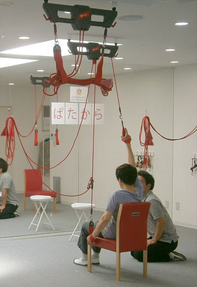 初めての方もご安心ください!当デイサービスでは、早稲田のプログラムをもとに、理学療法士や看護師が安心安全の運動サポートを行います。スリングセラピー(吊りロープ)は身体に負荷が少なくリラックスして無理なく行えます。